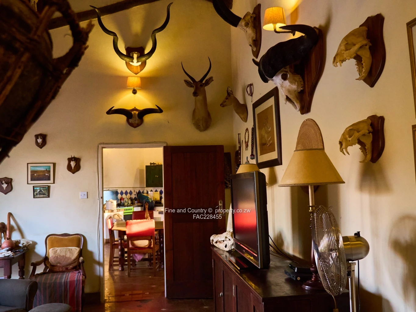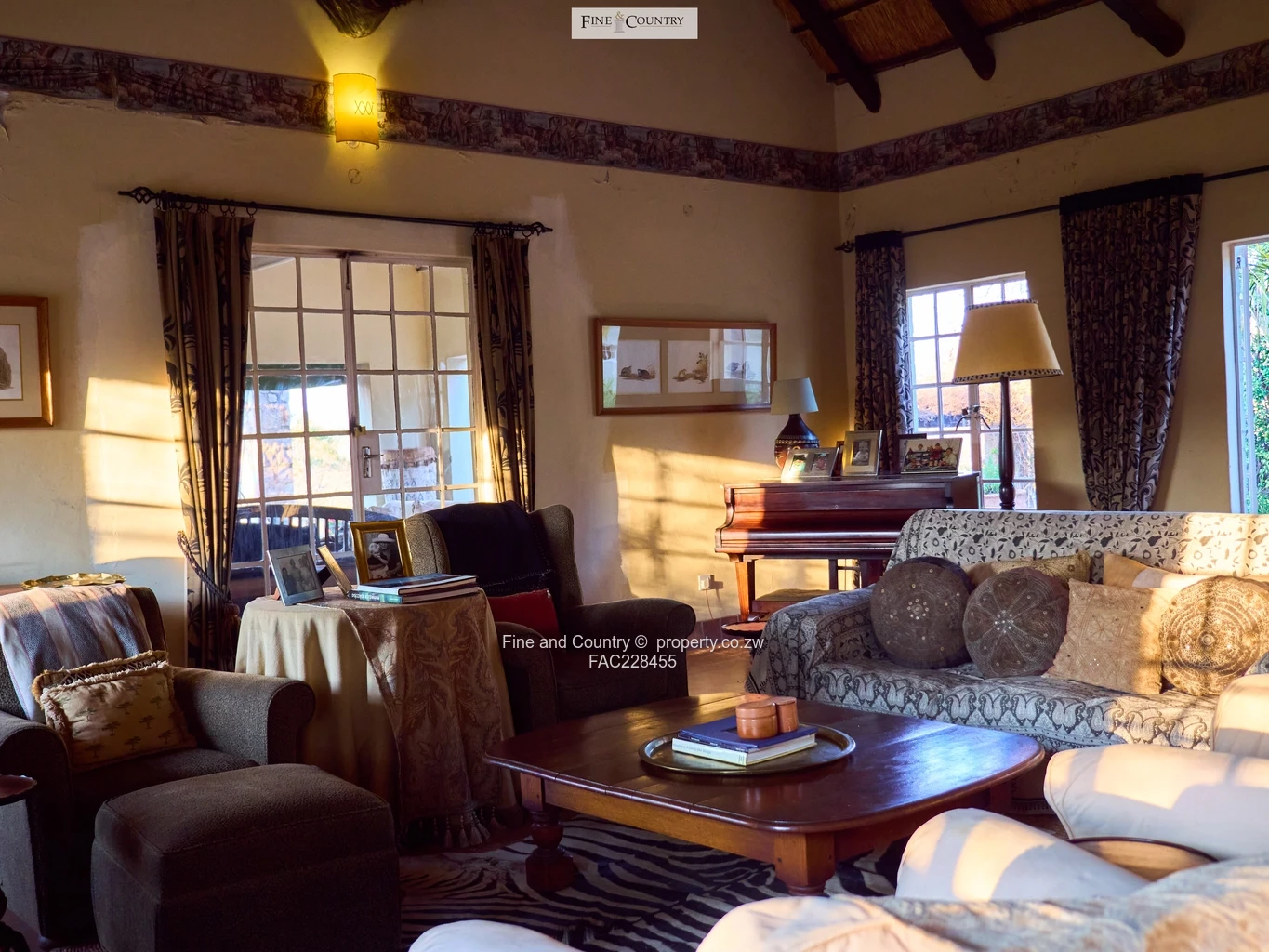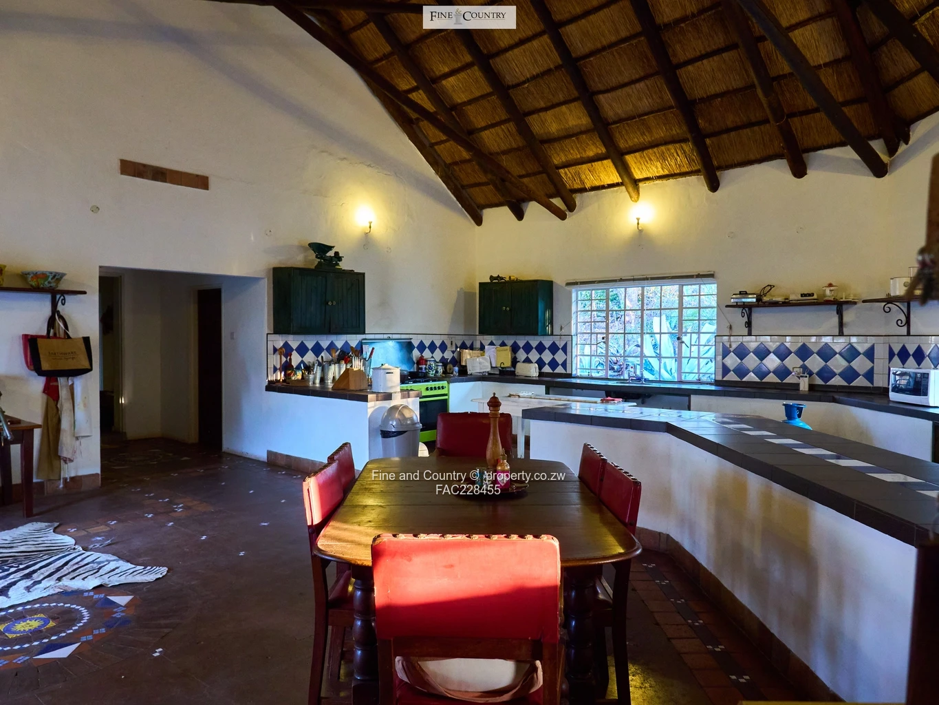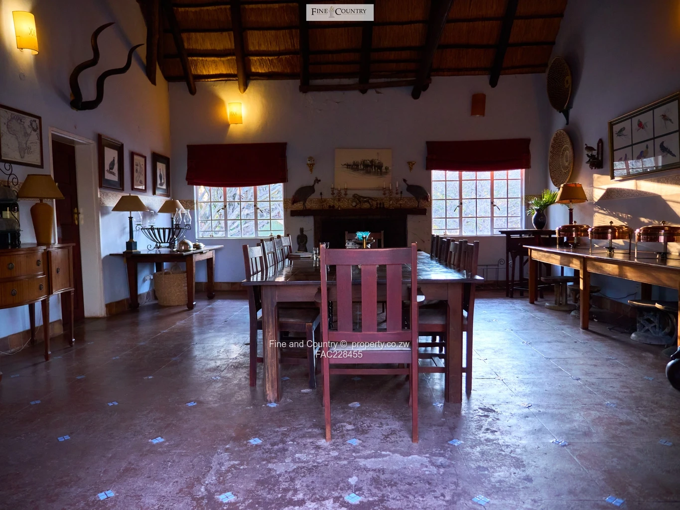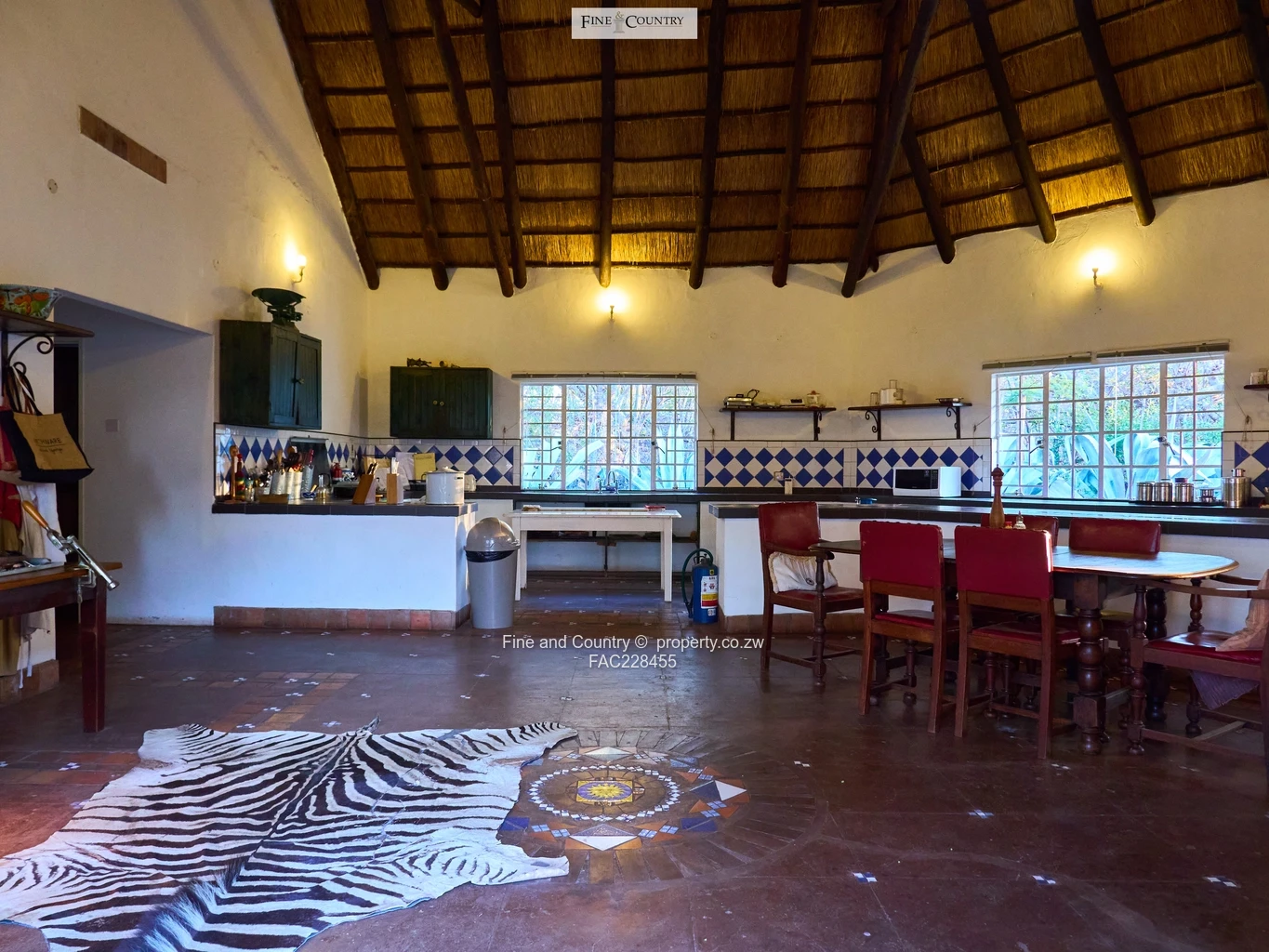 Interiors celebrate soaring thatch and timber rafters, warm stone floors and generous reception rooms shown in the photos: a formal lounge with classic African décor and mounted trophies, cosy fireplaces, and a grand, fully fitted kitchen opening to a spacious bar/entertainment area ideal for gatherings. Bedrooms are spacious and individually styled; bathrooms are practical with double basins and walk-in showers. Outside you’ll find a charming thatched boma/entertainment gazebo, manicured terraces and private nooks for relaxation.